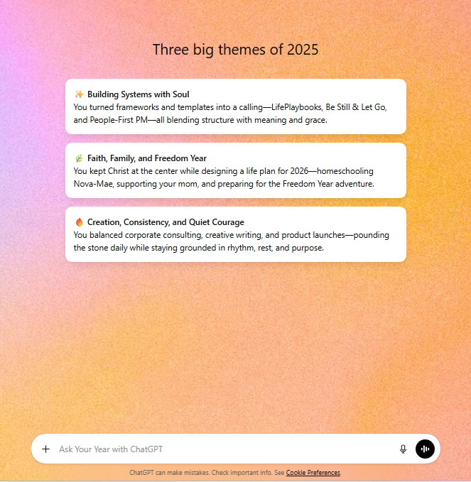 Here’s the line that matters most to me, the one I do not cross: When I type a question into ChatGPT, I don’t hand it authority. I bring my values, my faith, my context, and my thoughts, and I ask it to help me see the pattern. That boundary shapes everything. I don’t outsource discernment. I don’t replace prayer, reflection, or wisdom. I don’t ask a tool to tell me who I am or what matters. I use it to slow things down enough to see what matters for me.